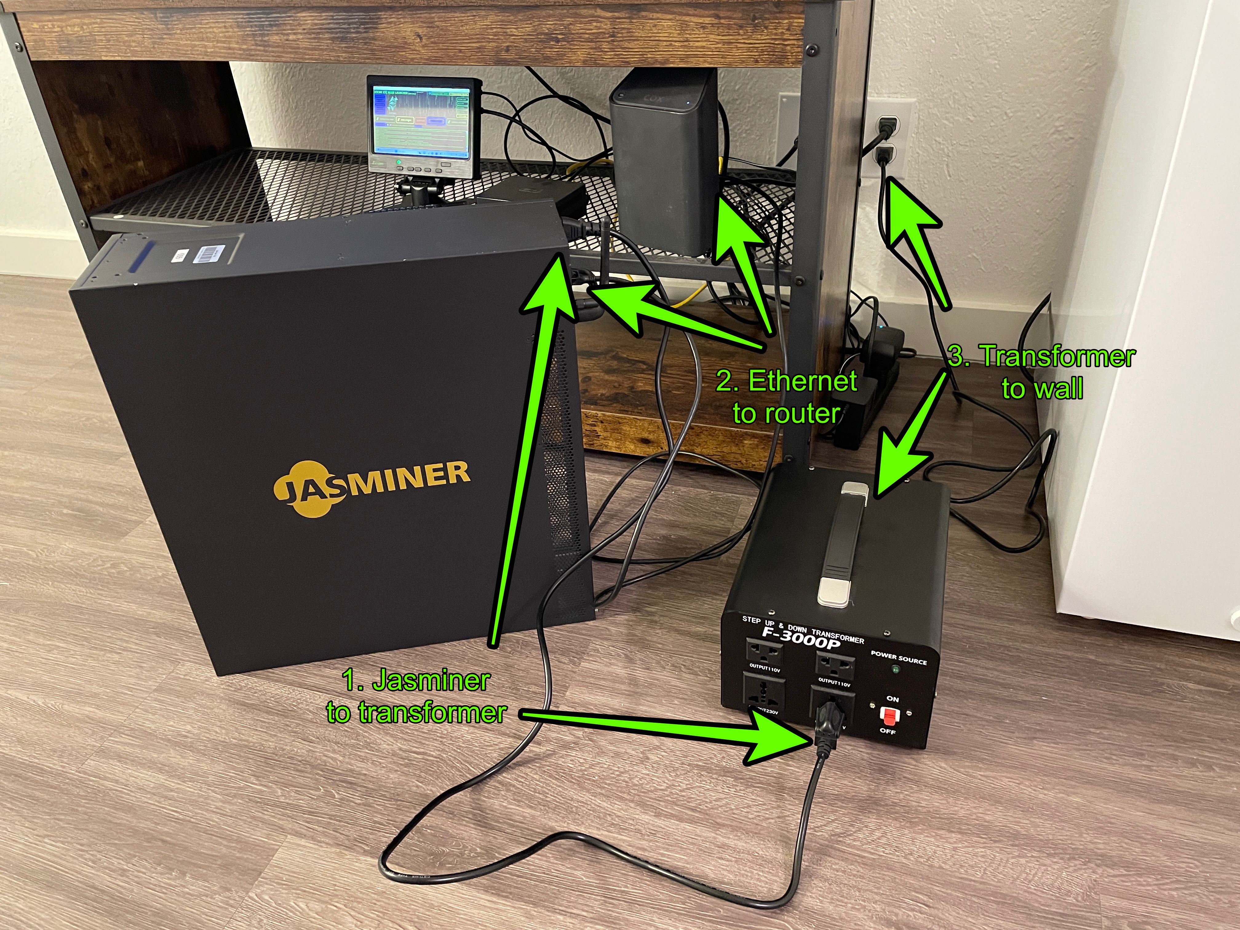 此外,我们需要一个电源升压变压器,因为在美国俄克拉荷马州的我们所在地,电压为110伏特,但Jasminer使用的是200至240伏特的输入电压。