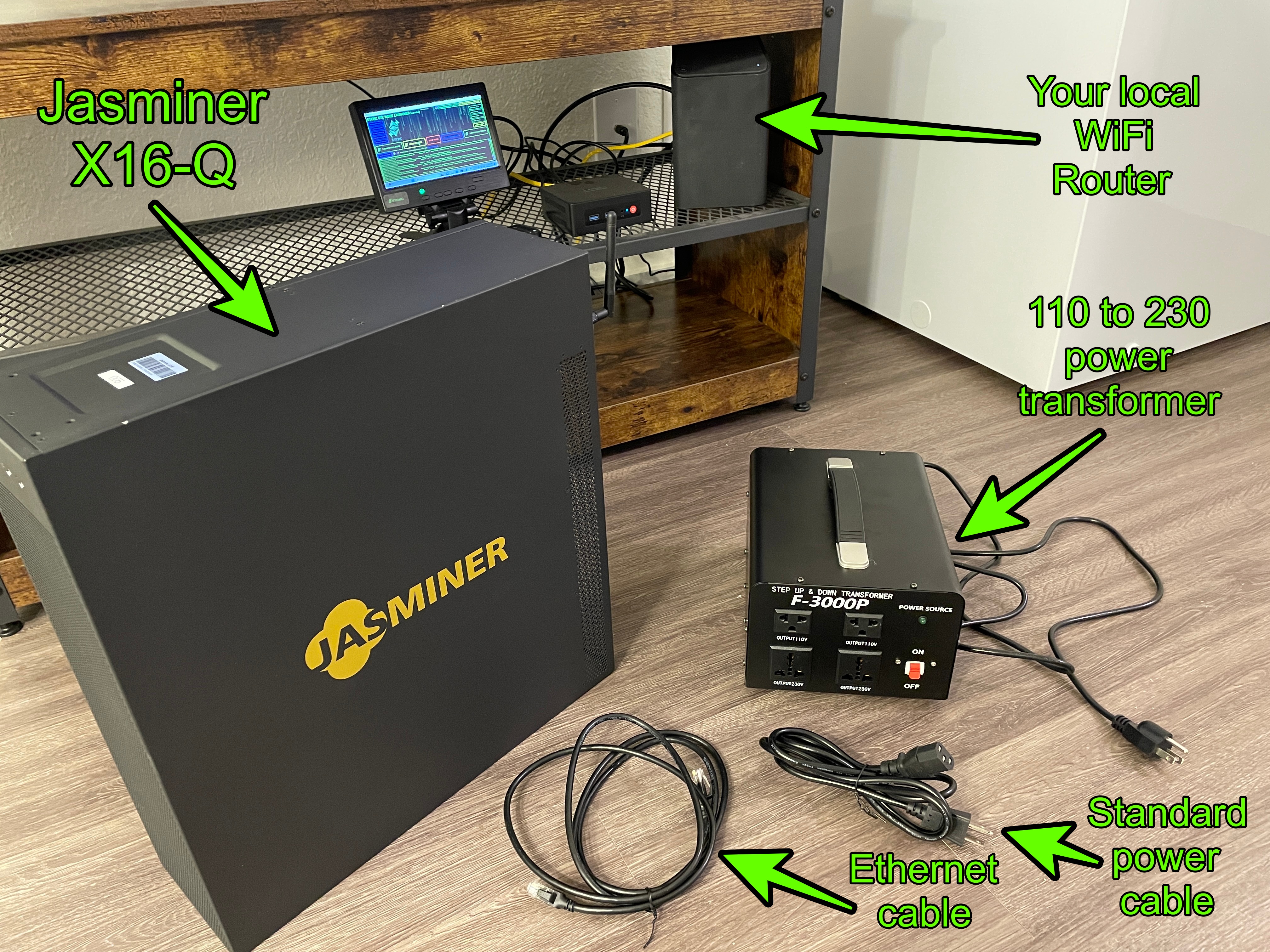 正如图像所示,我们有我们的Jasminer ASIC、以太网电缆、电源线、变压器(带电源线)以及用于连接和设置的互联网路由器。